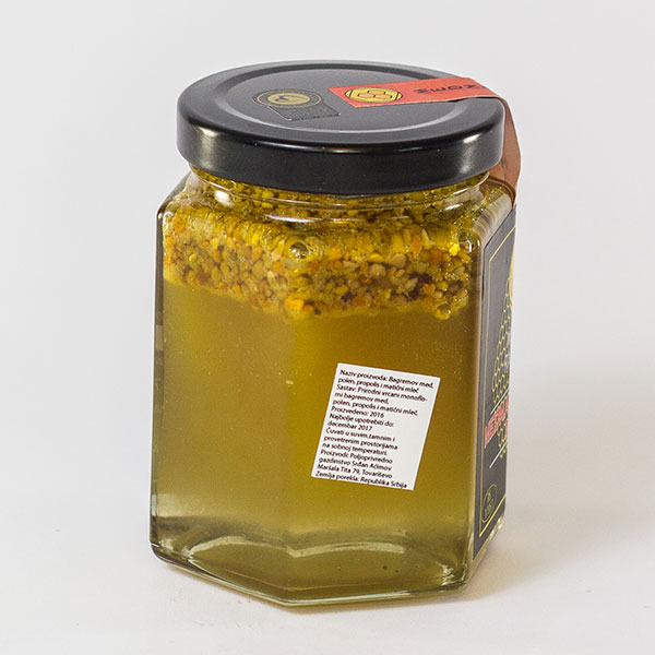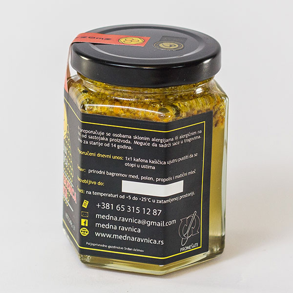 Sastav: Prirodni vrcani monofloni bagremov med, polen, propolis i maticni mlec
